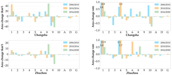 Area changes in the LCZs of Changsha, Zhuzhou, and Xiangtan for 2006–2010, 2010–2016, and 2016–2020. (a) The LCZ area change (km²). (b) The LCZ area change rate.