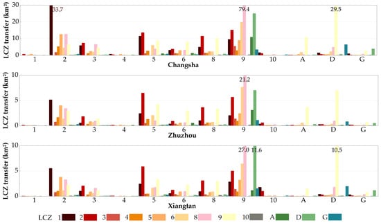 From 2006 to 2020, in the CZT urban agglomeration, the transfer between LCZ 2/LCZ 1, LCZ 5/LCZ 2, LCZ 9/LCZ 6 (open low rise), LCZ 9/LCZ 8, and LCZ 9/LCZ D (low plants) are close. Between them, LCZ 9 has the largest area converted into LCZ 8 (Figure 5).