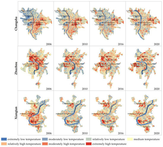 The LST spatial distribution of Changsha, Zhuzhou, and Xiangtan in 2006, 2010, 2016, and 2020, respectively.