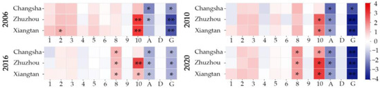 As is shown in Figure 4a, from 2006 to 2020, the total area of LCZ 8 (large low rise) increased the most, followed by LCZ 1 (compact high rise) in the CZT urban agglomeration. In Changsha, LCZ 9 (sparsely built) showed the largest area reduction, followed by LCZ 2 (compact mid rise). In Zhuzhou and Xiangtan, LCZ 9 had the largest reduction in area, followed by LCZ 5 (open mid rise). The area of LCZ A (dense trees) and LCZ G (water) in the CZT urban agglomeration largely remained unchanged. As is shown in Figure 4b, from 2006 to 2010, LCZ 1 had the largest growth rates among the three cities. Its growth almost stagnated from 2016 to 2020. The growth rate of LCZ 4 (open high rise) is second, and its changing pattern is consistent with LCZ 1. From 2006 to 2010, LCZ 2 in Changsha rapidly decreased. From 2010 to 2020, LCZ 10 (heavy industry) in the CZT urban agglomeration also rapidly decreased.