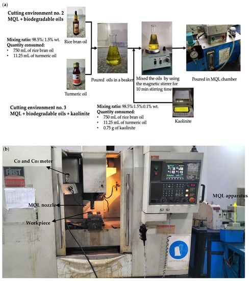For the cutting fluid preparation, the magnetic stirrer (CJJ78-1, Jiangsu Jinyi Instrument Technology Co., Ltd., Changzhou, China) was used to mix the rice bran oil, the turmeric oil, and the kaolinite with the 10 min stirring time. The properties of the oils and nanopowder used in the minimum quantity lubrication (MQL) cutting environment are shown in Table 4, while Figure 1a depicts the specifications of the three cutting environments employed in the experimental research.