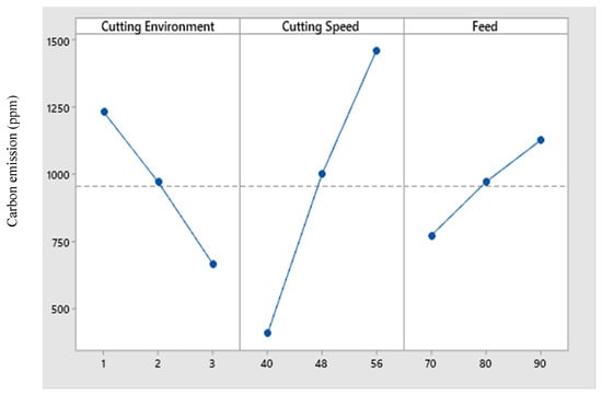 In addition, carbon emissions during machining were also attributed to the surrounding air. The atmospheric air contains 417 ppm of carbon dioxide due to global warming and climate change. In this study, under dry cutting conditions, the primary source of carbon emission was found to be the tool material, i.e., carbide. In the MQL cutting environment, rice bran oil and turmeric oil were used as cutting fluids. These oils contain fatty acids and unsaturated double bonds, but they generate less CO2 during the metal cutting process compared to mineral oil and kerosene oil, mainly because of their higher volatile temperature values. Rice bran and turmeric oils have volatile temperatures of 232 °C and 183 °C, respectively, while mineral oil and kerosene oil have volatile temperatures of 168.3 °C and 38 °C, respectively []. It is believed that the vegetable oils prevent the TiAlN coating of the carbide end mill cutter from damage and also reduce the heat generation, resulting in fewer emissions being produced, as shown in Table 6.