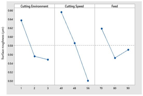 Ensuring the surface quality of machined parts is crucial for their performance, and it can be measured both quantitatively and qualitatively. The quantitative results of average surface roughness (SR) obtained using the fuzzy logic technique are presented in Table 5. To analyze the effects of different parameters on SR, main effects plots were generated, depicted in Figure 3. The results show that cutting environment and cutting speed exhibit a decreasing linear trend on SR, while feed (F) demonstrates a nonlinear behavior. Additionally, the surface finish was found to be improved under the third cutting environment, which involved the use of MQL with rice bran base oil, and turmeric oil and kaolinite nanoparticles as additives. Table 5 and Figure 3 demonstrate that the minimum surface roughness (0.3 μm) was obtained using MQL with rice bran base oil and turmeric oil and kaolinite nanoparticle additives at 56 m/min cutting speed (CS), while the highest SR value (0.9 μm) was observed in a dry environment at 40 m/min CS.