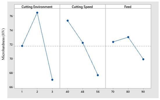 The second cutting environment, which involved MQL with rice bran and turmeric oil, showed an increase in microhardness values below 50 μm depth compared to the bulk hardness (72 HV). To analyze the effects of process parameters on microhardness, main effects plots were generated, shown in Figure 4. From Figure 4, it can be observed that the cutting environment and feed exhibit a nonlinear trend, while the cutting speed shows a decreasing linear behavior. Regarding cutting methods, the highest microhardness value (84 HV) was obtained with the use of MQL with rice bran base oil and turmeric oil at a cutting speed of 56 m/min, as shown in Table 5 and Figure 4.