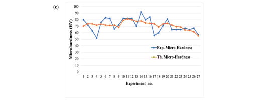 Upon graphically plotting the difference between the experimental and predicted values (obtained through regression analysis) using Equations (1)–(3), it was observed that the difference between the actual and predicted values was less than 20% data error, indicating the reliability of the empirical models. This is depicted in Figure 5a–c, which show the percentage error between the experimental and predicted values for carbon emission, surface roughness, and microhardness, respectively.