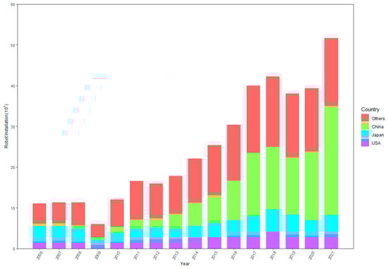 Robot installations from 2006 to 2021: World, the USA, China, Japan, and others. (Source: IFR, https://www.ifre.com, accessed on 20 October 2021).