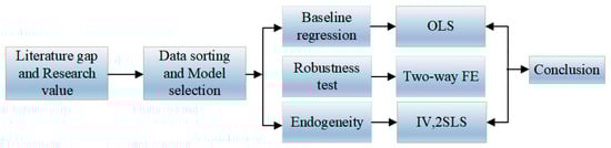 On the one hand, the scale of industry and the advanced degree of industrialization are essential to the economic growth and energy consumption structure in the sustainable development of the environment. On the other hand, there are various diversities of development levels among different countries such as populations, employment rate, science, and technology etc. Hence, this study verifies the impacts of increasing adoption of industrial robots on carbon emissions separately from the total amount of industrial robot installations and its density. We will take these factors—economic growth level, labor market, industrial structure, energy consumption structure—into our research consideration to investigate the influence of industrial intelligence on carbon emissions. Figure 2 presents the design and steps of this study.