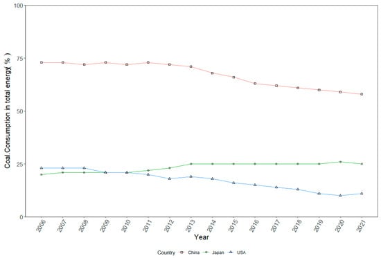 Proportion of coal consumption in total energy from 2006 to 2021: the USA, China, and Japan. (Source: EIA, https://www.eia.gov, accessed on 20 October 2021).