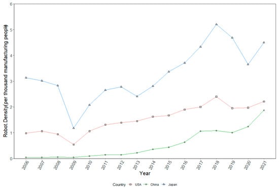 Robot installation density (units per thousand manufacturing employees) from 2006 to 2021: the USA, China, and Japan. (Author’s calculation).