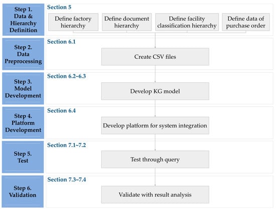 The KRM was built using key information such as the PO’s project title, delivery date, completion date, and scope of supply of the PO. The authors defined the factory, document, and facility classification hierarchies of the supply items for the effective retrieval and classification of the KRM. In this study, the authors constructed the POKREM, a knowledge retrieval model of Pos for a steel plant based on a graph database for the semantic search of PO. As shown in Figure 1, this study consisted of six steps.