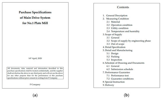 The PO data items were selected from purchase specifications corresponding to the technical specifications of the PO documents of Company P. From the cover of the documents, the project title, target process, and published date were selected as PO data. From the contents of the documents, the date of delivery, completion date, and supply items (refer to ‘3. Scope of Supply’ in Figure 2b) were selected as PO data. The contract number was used to identify a specific document among many purchase specification documents. Figure 2 presents the purchase specification documents of Company P, which are the source of the PO data. Figure 2a is the cover page of a PO, displaying common information about the document. The PO’s cover page shows the published date, target process, and project title. Figure 2b shows the table of contents of the PO, which consists of nine chapters, from 1. General Description to 9. Delivery. The information on supply items used in this study is in chapter “3. Scope of Supply”.