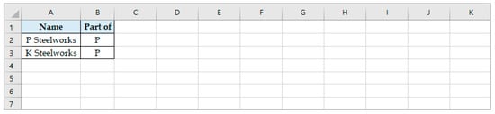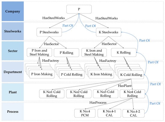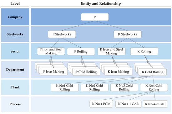 Company P is at the top tier of the factory hierarchy. Company P has two steelworks under the Steelworks label. Because Company P has two steelworks, there may be duplicate names in the tiers lower than steelworks. To solve the problem of duplicate names, “p” was added to the names of the subnodes included in P Steelworks, and “k” was added to the names of the subnodes included in K Steelworks. Each steelwork has a pig iron and steel sector and a rolling sector. The sector label for pig iron and steel has department labels for pig ironmaking and steelmaking. The sector label for rolling has department labels for thick plates, hot rolling, cold rolling, and plating. Each department has at least one plant. However, our definitions in the construction of POKREM were limited to a small number of plants in the cold-rolling department because this study targets POs in the cold-rolling department. Each plant is classified into processes according to its functions, and each plant has at least one process. In the present study, many processes were not defined; only processes deemed necessary for the study were defined to keep definitions to a minimum. To define the factory hierarchy of Company P, we discussed it with five engineers who had worked there for more than ten years. Figure 3 displays the hierarchical structure using specific data based on the steel plant where the case study was conducted. Note that there is not sufficient space to represent the entire factory hierarchy.