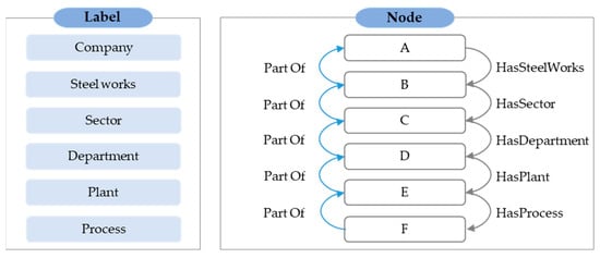 If this description in Table 3 is abstracted, it can be expressed as follows: Node A has node B, and node B is part of node A. A relationship called “HasSteelWorks” exists between nodes A and B. As the direction of the arrow is from node A to node B, node A becomes the subject. Node B becomes the object, and “HasSteelworks” becomes the relationship. When the direction of the arrow is from node B to node A, the relationship between the two nodes can be described as follows: Node B is the subject. Node A is the object, and the relationship between the two nodes is “PartOf”. A node included in a relatively lower-tier label in the plant hierarchy is connected to a node included in the upper-tier label by a relationship called “PartOf”. By contrast, a node included in a relatively upper-tier label is connected to a node included in a lower-tier label by a relationship of “HasSteelworks”, “HasSector”, or “HasDepartment”. These descriptions are displayed in Figure 4.