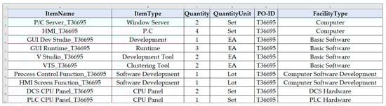 An item node was defined as an item included in the PO’s Scope of Supply. To identify each node, a necessary process in KG development is to set a naming rule to distinguish between names and nodes of the same type. The semantic web uses uniform resource identifiers (URIs) to distinguish the identities of nodes with the same name [10]. Items of the same type are not the same if they are included in different POs even if they have the same name. In this study, the name of each item node was defined using the item name and PO contract number to prevent duplication of the name when the same type of item was included in multiple POs. The type, “Quantity”, and “Quantity Unit” were defined as properties of the item node. Each item was included in the Scope of Supply of the PO node that has the value of the column name “PO ID”. Table 7 presents the information on ten item nodes under PO contract number T36695 among the 80 item nodes. Each item node has a relationship with a facility classification node having as its name the value of the column name “Facility Type”.