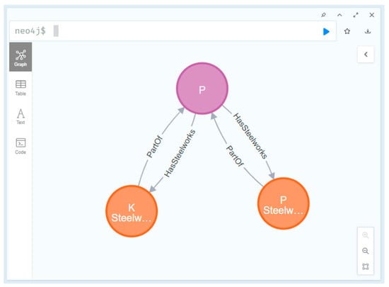 The information entered as input for constructing a KG should be in the form of a triple [10] to facilitate the semantic search. The relationship between the nodes is represented only when the information is defined in the triple form to make it possible to perform reasoning, semantic retrieval, and discovery of new facts using this pattern of nodes and relationships. The triple form allows the KG to be built using the defined factory hierarchy. The name of each tier becomes the label of the nodes belonging to the pertinent tier. Relationships exist between nodes belonging to neighboring tiers, as represented by the arrows in Figure 3. There are two relationships between one node of the upper tier and one node of its neighboring lower tier. The two arrow directions represent this relationship. For example, Company P has P steelworks or K steelworks, and P steelworks or K steelworks are part of Company P. Table 3 lists some of the data shown in Figure 3 in triple form. In Table 3, the subject and object are nodes, whereas “Relationship” refers to the relationship between the subject and object. The arrow of the relationship has a direction starting from the subject and heading toward the object. Referring to the first row of Table 3, the subject is node P, and the object is node P steelworks. A relationship called “HasSteelworks” is observed between the two nodes. In this case, the arrow of the relationship has a direction starting from node P and heading toward node P steelworks. Finally, referring to the first row of Table 3, the label of node P is “company”, and that of P steelworks is “steelworks”.