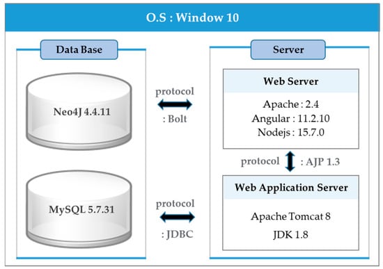 The operating system (OS) used in this study was Windows 10 [48]. The graph database used by Windows OS was Neo4j [49]. As of 6 February 2022, Neo4j ranked number one in popularity among the graph database engines (DB-engine.com) [50]. Neo4j uses Cipher as its query language and can be accessed from other programming languages using a protocol called Bolt. In the process of developing the POKREM using a graph database engine, the process of developing a KG should not be difficult. Therefore, the authors decided on Neo4j as the graph database DBMS. Considering that the query syntax of Neo4j is not complicated, it is easy to find relevant information, and thus Neo4j has been number one in popularity among graph databases in the last ten years. Table 2 shows the development environment of the POKREM.