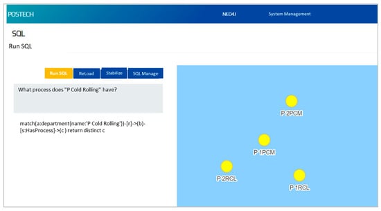 This section describes the development process of the POKREM for the POs of a steel plant. First, the authors defined four domains to configure the POKREM: factory hierarchy, document hierarchy, facility classification hierarchy, and PO data. These four domains facilitate PO document retrieval. Second, the authors created CSV files for the data preprocessing procedure to efficiently generate multiple nodes, relationships, and property values. Information from the four defined domains was used as the input data to create the CSV files. Third, the CSV import function was used to create the structures defined earlier on the Neo4j Graph DBMS, and a rule-based reasoning function was applied. This reasoning function enables a search that considers the context. The four domains were all created in a form connected to the graph database, and many nodes and relationships were created using nine-rule-based reasoning. Subsequently, the POKREM’s platform was developed using a web server for user convenience. The platform was configured such that the developed model could be used at any location with access to a network. Fifth, the tests were performed in three stages. Finally, the test results were checked, and usability verification was performed by the users. The tests were divided into three stages of difficulty, and each test consisted of queries and correct answers. The queries and correct answers in the first stage were related to one domain and those in the second stage to two or more domains. Finally, the third-stage test consisted of queries and correct answers related to reasoning. Tests were conducted to compare the results of executing queries in the developed model with the correct answers, and usability was verified by engineers who had worked for more than ten years in the plant sector.