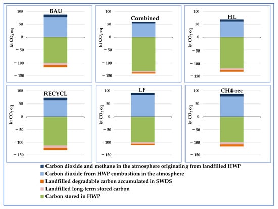 In the BAU scenario, total projected cumulative emissions were 88 kt CO2 equivalent (eq) and 197 kt CO2 eq until 2050 and 2130, respectively. The projected amount of carbon stored in wood products was −100 kt CO2 eq for 2050 and −17 kt CO2 eq for 2130. The total amount of carbon stored long-term at landfills was predicted to be −9 kt CO2 eq in 2050 and −17 kt CO2 eq in 2130. Figure 1 shows the carbon storage and cumulative CO2 and CH4 emissions of the different scenarios until the year 2050.
