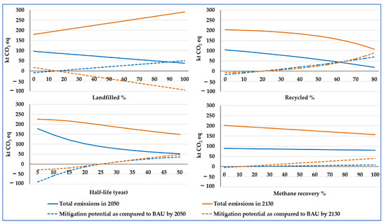 In Figure 2, we demonstrate the results of a sensitivity analysis carried out to assess the impact of modifying each parameter between its lowest and highest possible values, while keeping the other three parameters constant at the BAU scenario value. As shown in Figure 2, an increased half-life, recycling rate, and methane recovery reduced emissions over the entire projection period. On the other hand, an increase in the amount of landfilled wood waste reduced emissions until 2050 but increased them significantly between 2050 and 2130. Changing methane recovery had the smallest emission reduction effect, as in the BAU scenario the amount landfilled was only 15% and CH4 emissions did not have a great share in total BAU emissions. Increasing the recycling rate had the biggest emission reduction effect, followed by increasing half-life values.