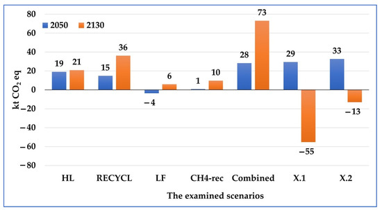 The mitigation potential of each scenario was calculated as the difference between the cumulative emissions of the BAU scenario and the examined scenario. Considering the entire projection period, the mitigation potential of the combined scenario was the largest, followed by that of the RECYCL scenario (Figure 3). This means that these scenarios allowed for the largest emission reductions in the modelled period. Considering the period up to 2130, scenarios of the X series had negative mitigation potential values, i.e., these scenarios resulted in additional emissions as compared to the BAU scenario.