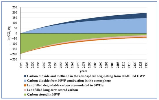 Regarding the impacts of solid waste disposal, the results of scenario series X are the most representative. We extended the modelling period until 2130 in order to examine the delayed impact of the decay of degradable organic material in landfills. Wood waste with its half-life of 35 years degrades relatively slowly and results in significant methane emissions many years after being deposited. Our results show that in the long term, increasing the rate of the wood waste being landfilled results in disproportionately high methane emissions. As the global warming potential (GWP) of CH4 is 25 times higher than that of CO2, emissions expressed in CO2 equivalent units are even higher. Considering climate mitigation objectives, it is essential that every possible CH4 emission is avoided; therefore, landfilling organic waste is the worst alternative [23,27]. Speak et al. [65] also found in their study that the fate of end-of-life wood has significant implications for carbon budget calculations, and there are remarkable differences between end-of-life wood management technologies. According to their investigation, energy recovery for electricity was the most efficient with a carbon-emissions-per-input ratio of 0.5 [65]. They found that landfilling wood waste was the least efficient measure, with a ratio of 121.9 [65].