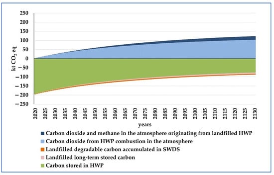 Only part of the degradable organic carbon in waste wood disposed in SWDS will decay into both CH4 and CO2; the part that will not decompose will be stored long-term in the SWDS [28]. Long-term stored carbon was calculated as follows (Equation (11)).