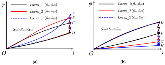 Flux-linkage trajectories under different turn-on and turn-off angles:(a) The turn-off angle is fixed and the turn-on angle is changed; (b) The turn-on angle is fixed and the turn-off angle is changed.
