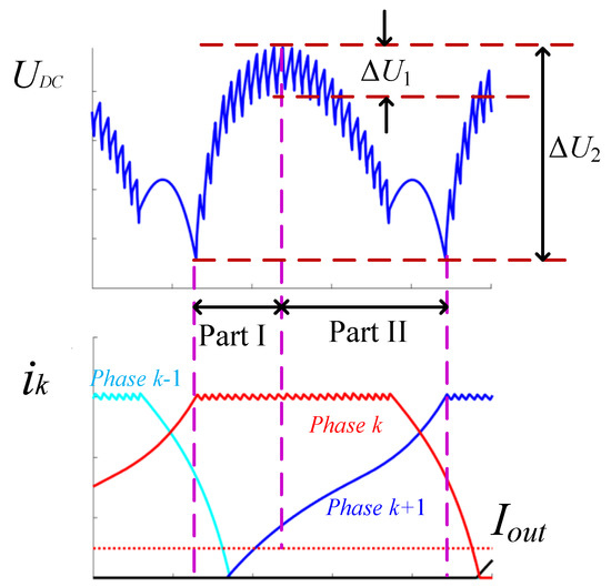 The typical relationship between phase current and output voltage is shown in Figure 3. As shown in the figure, the output voltage ripple can be classified as high-frequency voltage ripple, which is caused by current chopping and shown as ΔU1, and low-frequency voltage ripple, which is caused by commutation and shown as ΔU2.