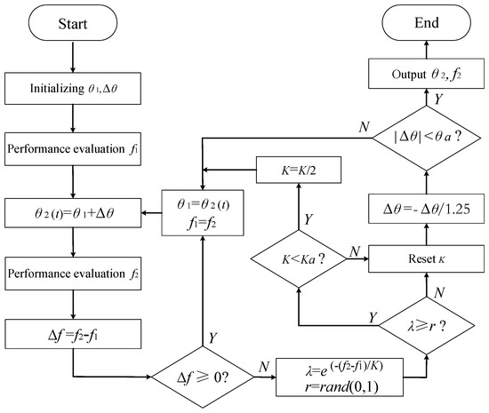As shown in the figure, SAA is similar to the climbing searching algorithm but can avoid local optimum. For turn-off optimization, the optimizer evaluates the system performance according to the output power (i.e., f stands for the output power in Figure 5). If the latest performance is improved (i.e., Δf > 0), the optimized angle is refreshed. Otherwise, the optimized angle is refreshed according to Metropolis rules and the disturbance is changed (i.e., Δθ = −Δθ/1.25). During the optimization process, the initial turn-off angle is set as θ1 = 42°; initial disturbance is set as Δθ = 1.44°; coefficient K and Ka are set as K = 0.01 and Ka = 0.001, respectively; the minimum disturbance θa is set as θa = 0.18°.