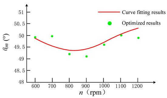 In Figure 6, optimized turn-off angles under different rotor speeds are shown as green spots in the figure. The red dashed line in the figure shows the curve fitting results according to (12), by which the turn-off angle can be regulated according to real-time rotor speed n on-line.