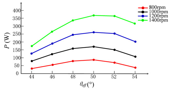 Figure 8 shows the relationship between output power and turn-off angle at different rotor speeds, where the turn-on angle is fixed at 20°, the phase current constraint is set as 10 A and the range of turn-off angle is set as 44–54°. Section 2 presents that the maximum output power under constant phase current constraint is sensitive to both turn-on and turn-off angles. As shown in the figure, when the rotor speed is fixed, increasing the turn-off angle, absorbed mechanical energy is increased, so the output power is increased. When the turn-off angle enters the unaligned position, the effective generation range (the inductance drop region) decreases, resulting in the output power being reduced. So, there is an optimal turn-off angle to maximize the output power.