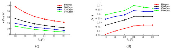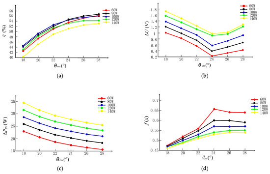 Figure 9 shows the relationship between concerned control objectives and turn-on angle at different output power, where the turn-off angle is regulated according to (12) and the rotor speed is fixed at 800 rpm. As shown in Figure 9a, system efficiency can be improved by increasing the turn-on angle. However, the increase in the turn-on angle leads to an increase in the reference current and copper consumption. So, the closer turn-on angle to the align position, the slower system efficiency will be increased. Although the simulation cannot reflect accurate system loss, the trend of system efficiency verifies that system efficiency can be improved. Figure 9b shows the relationship between the output voltage ripple and turn-on angle at different output power. Section 2 presents that the output voltage ripple is sensitive to turn-on angles. As shown in the figure, with the increase of the turn-on angle, the voltage ripple shows the trend of first decreasing and then increasing. So, there will be an optimized turn-on angle that minimizes output voltage ripple. Figure 9c shows the relationship between power converter loss and turn-on angle at different output power. Power electronics devices will have fewer on-time and switching times as the increment of turn-on angle, so the power converter loss is reduced. Combining the above concerned factors, Figure 9d shows the relationship between multi-objective evaluation results and turn-on angle, and that there will be an optimized turn-on angle for multi-objective optimization.