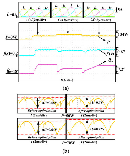 Figure 12 shows the dynamic response for turn-on angle tuning at 800 rpm and the turn-off angle is regulated according to (12). The phase current at steady operation is shown at the top of the figure and SRG operates in the current control mode. The controller sets the output power as the top control objective. Figure 12a shows the dynamic response from 0 W to 50 W, from 50 W to 70 W and from 70 W to 50 W respectively. According to the experimental results, after the multi-objective optimization, the system efficiency is improved, the power converter loss is reduced and the voltage ripple is increased. Figure 12b shows the comparison of output voltage ripple before and after optimization. In order to improve the overall performance, voltage ripple is sacrificed to a certain extent. It can be seen from experiments that when the output power changes from 50 W to 70 W, the system efficiency is reduced, the voltage ripple is improved and the power converter loss is increased. Parameter changes eventually lead to a decrease in the value of the multi-objective function. When the output power changes from 70 W to 50 W, the change trend of the above parameters is reversed.