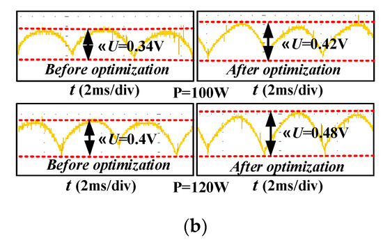 Figure 13 shows the dynamic response for turn-on angle tuning at 1200 rpm and the turn-off angle is regulated according to (12). As shown at the top of the figure, SRG operates in single pulse mode. Figure 13a shows the dynamic response from 0 W to 100 W, from 100 W to 120 W and from 120 W to 100 W, respectively. According to the experimental results, after the multi-objective optimization, the system efficiency is improved, the power converter loss is reduced and the voltage ripple is increased. Figure 13b shows the comparison of voltage fluctuation before and after optimization, which is also sacrificed for improvement of overall performance.