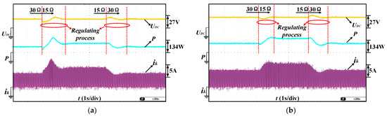 Figure 14 shows the output voltage response and output power response when load changes from 30 Ω to 15 Ω, from 15 Ω to 30 Ω, respectively, at 1200 rpm. The voltage closed-loop controller controls the output voltage to the target value by adjusting reference current. In Figure 14a, the target value of output voltage is set 20 V. When the resistance changes from 30 Ω to 15 Ω, the load increases. In order to stabilize the output voltage, the output power is increased. If the disturbance of output power exceeds the maximum output power variation range (5 W in Section 3), the turn-on angle will be re-optimized. Similarly, when the resistance changes from 15 Ω to 30 Ω, the load decreases, and the output power is decreased. Figure 14b set the target value of output voltage to 24 V and shows similar variation with Figure 14a.