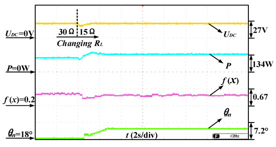 Figure 15 shows the dynamic response for turn-on angle tuning when load changes at 1200 rpm. When the resistance changes from 30 Ω to 15 Ω, the load increases. The disturbance of output power caused by the load change exceeds the maximum output power variation range, so the turn-on angle is re-optimized.