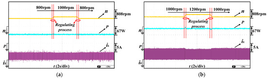 Output voltage response and output power response when rotor speed changes: (a) The output power is 70 W and the motor speed changes from 800 rpm to 1000 rpm, from 1000 rpm to 800 rpm, respectively; (b) The output power is 120 W and the motor speed changes from 1000 rpm to 1200 rpm, from 1200 rpm to 1000 rpm, respectively.