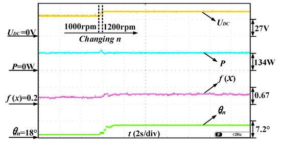 Figure 16 shows output voltage response and output power response when rotor speed changes. The output power in the Figure 16a is 70 W and the motor speed changes from 800 rpm to 1000 rpm, from 1000 rpm to 800 rpm, respectively. The output power in the Figure 16b is 120 W and the motor speed changes from 1000 rpm to 1200 rpm, from 1200 rpm to 1000 rpm, respectively. The power closed-loop controller remains the output power stable. However, changes in rotor speed can cause disturbances in the output power. If the disturbance exceeds the maximum output power variation range, the turn-on angle will be re-optimized.