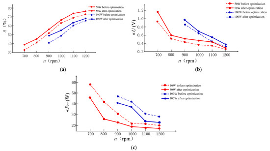 Figure 18 shows the effectiveness of the proposed solution. The output power is fixed at 50 W and 100 W respectively. As shown in Figure 18, after multi-objective optimization, system efficiency is improved and power converter loss is reduced. Although output voltage ripple is increased in concerned speed range, the overall performance is improved by the proposed solution.