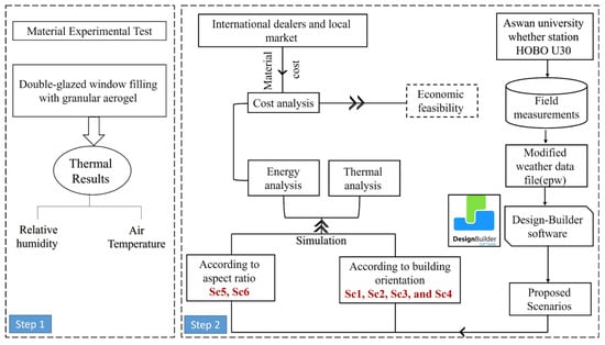 There were two significant steps in this study. The first step, as shown in Figure 1, was evaluating the field in two similar rooms with the same geometry built on top of Aswan University buildings. Then, just one room’s window was prepared for aerogel glazing on the construction site. This step aimed to find a low-cost experimental model that can be used to test how aerogel glazing affects the temperature indoors. In the second step, Design-Builder software was used to model and simulate the effect of aerogel glazing on the temperature inside the Egyptian Japanese schools in Aswan city and the amount of energy needed to cool the schools. The main building case study is that of the Egyptian Japanese schools. However, in the first step of this study, the focus is on a room at Aswan University that is being studied, because it costs less to install aerogel glazing on a small scale. Finally, an economic analysis was held to investigate the effect of installing these aerogel glazing systems in the case study model (Egyptian Japanese school), which was simulated in the same step.