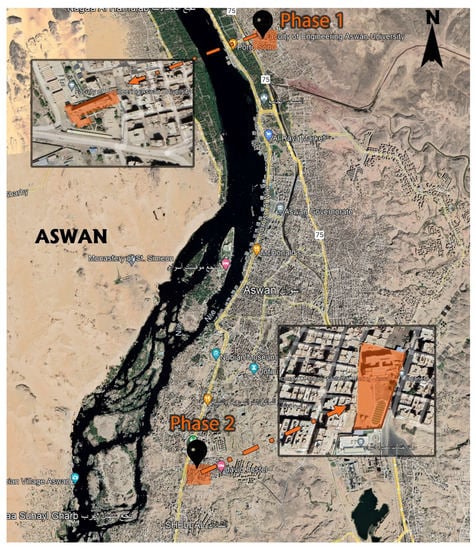 According to the Köppen–Geiger classification (Köppen-Geiger, 2022), Egypt has a desert hot arid climate, meaning the weather is mostly hot and dry. Aswan is a governorate in the south of Egypt, between the coordinates 24°05′26″ N and 32°53′57″ E. Aswan city is 879 km from Cairo. It is 194 m above sea level and has a governorate area of 34,608 km2. The climate in Aswan is hot during the summer and warm in the winter. It is characterized by a continental climate, with an increase in maximum and minimum temperature differences throughout 24 h, regardless of the season. The two places where the study investigation took place are shown in Figure 2. The first was at the Faculty of Engineering at Aswan University. The second phase took place as a case study building at the Egyptian Japanese School.
