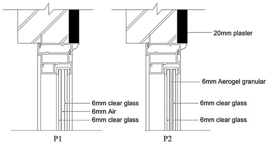 Table 1 displays the characteristics of the building materials used in Rooms 1 and 2, except for the material used to fill the windows. Referring to Figure 4, the window in room 1 has a total thickness of 18.00 mm (6 mm glass + 6 mm air + 6 mm glass). Similar glazing can be found in Room 2, but 6 mm aerogel granules fill between panes. All other materials and components are identical. The two rooms have 0.12 m brick walls. Each room has one door 0.9 m wide and one double-glazed window 1.00 m wide. P1 and P2 in Figure 4 refer to the windows in Room 1 and Room 2, respectively. Air is the filling material for P1; aerogel granules are the filling material for P2.