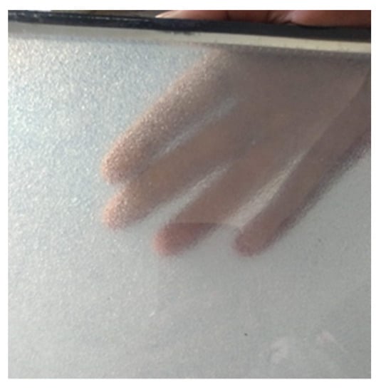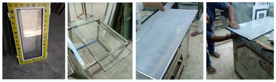 Figure 5 shows the processes followed to produce a window sample consisting of a double-glazed window made of clear glass. The area between the panes of glass was then filled with aerogel granules. Using the datasheet for the silica aerogel granule sample, it was determined that its thermal conductivity is about 0.18 W/m K. As shown in Figure 6, the tested material displays very little transparency. This helped let in natural light and reduce glare in the testing room.