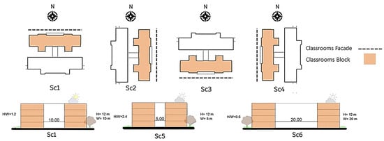 Several potential scenarios for the building under study were implemented in the simulation. Two significant categories were employed to generate these concepts. The orientation of the classrooms is the first category. Figure 7 shows four alternative scenarios (Sc1, Sc2, Sc3, and Sc4) for the north, east, south, and west directions, respectively. The second category is the aspect ratio of the inside semi-open courtyard, which resulted in two distinct scenarios (Sc5 and Sc6). These scenarios were tested with 6 mm thick double-paned windows filled with aerogel granules. At the same time, the current base-case scenario (BC) is a single pane of transparent glass 3 mm thick, which is conventional for Egyptian schools. The specifications of the analyzed window scenarios are presented in Table 2.