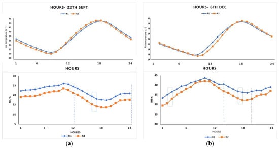 Air temperatures and relative humidity on (a) 22 September, (b) 6 December.