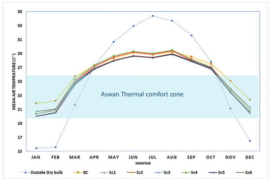 The environmental software (Climate consultant application) indicates that the thermal comfort zone for Aswan residents is between (19.5 °C and 26 °C). To attain thermal comfort and human health, buildings need to be cooled by air conditioning, increasing cooling energy consumption. This section contains the thermal results for building scenarios without air conditioning. The monthly mean air temperature for each scenario illustrated in Figure 9 is based on the simulation findings. The collected data indicate that the mean air temperature in Sc1 is lower than in the BC. The mean air temperature has decreased between 0.30 and 1.49 °C. In contrast, it was observed that the mean air temperature for Sc4 is greater than that of the BC from April to August, albeit by a small value (0.08 to 0.02 °C). Sc2 has a similarly modest impact, with a 0.06° to 0.19 °C monthly temperature increase (May to August).