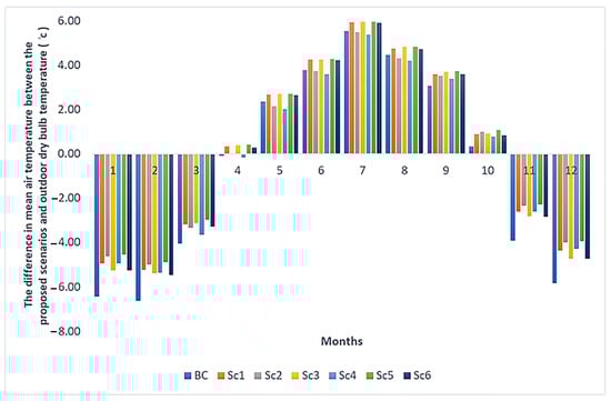 When comparing the mean air temperature variations from each scenario during the summer, as in Figure 10, the Sc5 scenario with an aspect ratio of 2.4 is the best option compared to the BC. Sc6, which has an aspect ratio of 0.6, is the best scenario for wintertime warming. During the summer, Sc3 (to the south) and Sc1 (to the north) experience almost the same difference in mean air temperatures. Sc4 was the most suitable winter scenario (west orientation).