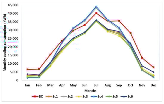 All the scenarios follow a similar pattern, with findings that can be summarized as follows. Firstly, Figure 11 shows that all analyzed scenarios, except Sc2 and Sc4, significantly reduced annual cooling demand compared to the BC scenario during the summer. However, Sc2 and Sc4 consumed the most energy for cooling compared to the BC scenario, ranging from 980 kWh to 3990 kWh. Secondly, annual cooling consumption for Sc1 decreased by around 23.2%, while Sc3 and Sc5 reduced their annual cooling consumption by approximately 26.3% and 25.7%, respectively, compared to the BC scenario (Figure 12). Thirdly, Sc4 (west orientation) had the smallest impact of all the scenarios, increasing cooling efficiency by just 11.2%, while Sc2 had a cooling efficiency boost of around 13.2%. Fourthly, Sc3, which faced the south side of the building, resulted in the greatest cooling savings ratio and improved the building’s energy efficiency by 72,600 kWh. Finally, in September, Sc3 had the highest rate of improvement in cooling use among all the scenarios, at 8950 kWh.