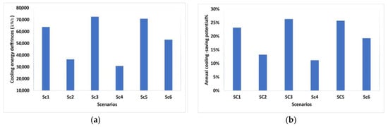 Annual energy in studied scenarios: (a) cooling energy consumption, (b) energy savings in terms of cooling purposes.