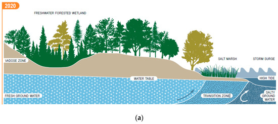 A review of the factors controlling groundwater flows is instructive. Precipitation recharges freshwater surficial aquifers that flow from inland/upland recharge areas to discharge areas in freshwater wetlands and streams, brackish estuaries, and saltwater wetlands and water bodies. In coastal areas, less dense fresh groundwater discharging to saltwater wetlands or water bodies flows over denser saline water [45] (p. 6). The salinity of groundwater can be influenced by mixing with adjacent tidal saline water, underlying denser saline water, and/or infiltration of saline water that inundates land surface during exceptional high tides and storm surges [45] (pp. 9–10). In inland areas of coastal forests, freshwater recharge and inflow of fresh groundwater from upland areas result in a freshwater-only environment. In coastal areas, fresh groundwater discharges over denser saline water and there is typically a transitional mixing zone of varying salinity [45] (p. 10). Tidal salt marshes often have complex interactions of fresh and saline water, with fresh groundwater discharging through the salt marsh at low tide and saline water inundating the marsh surface at high tide [45] (p. 10).